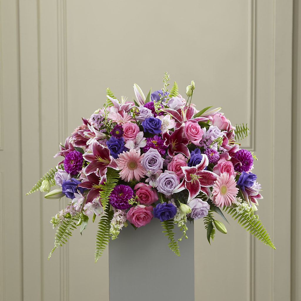 Si busca una forma especial de celebrar una vida y lamentar su partida, deje que este colorido arreglo floral mixto exprese su sincero amor y duelo. Este suntuoso arreglo, elaborado a mano por nuestros diseñadores artesanos, incluye espuelas de caballero rosas, gerberas y estátice, rosas rosa fucsia y lavanda, dalias bola rosa fucsia y lirios orientales, con exuberantes hojas de helecho espada.