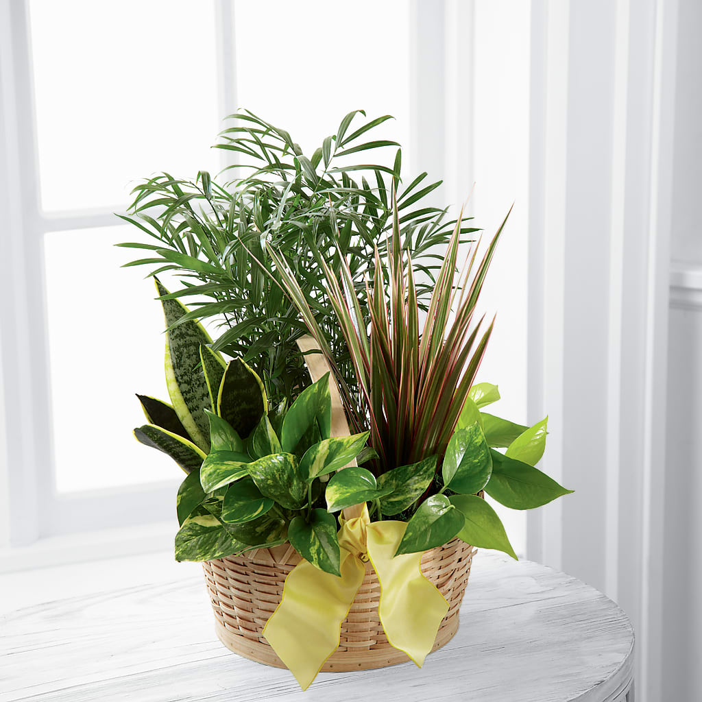 Nuestra maceta French Garden está hecha de exuberantes plantas verdes, un regalo ideal para cualquier ocasión especial. Con un surtido variado de 6 plantas verdes, este macetero se presenta en una cesta redonda de virutas de madera natural, adornada con una cinta de tafetán amarilla con alambre, una forma maravillosa de expresar tus sentimientos a través de la distancia.